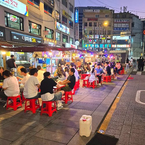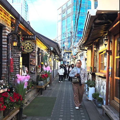 This was once an abandoned complex of old hanok houses, but now it’s a very popular spot that has been transformed into cafes and restaurants. It’s a cute alley, with cafes on one side, pork belly alley on the other, and a huge number of pojangmacha (street bars) in the evening, which makes it a really fun place.
